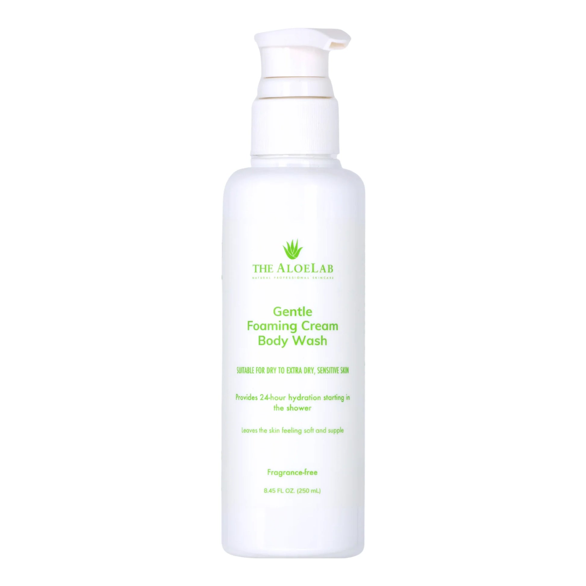 The AloeLab Gentle Foaming Cream Body Wash is fragrance-free, suits very sensitive skin, and has emollients to moisturize and soften the skin all day without disrupting the skin barrier. It provides 24-hour hydration starting in the shower. This comforting foaming wash helps protect the skin from the drying effects of water and leaves the skin clean, soft, and instantly soothed.