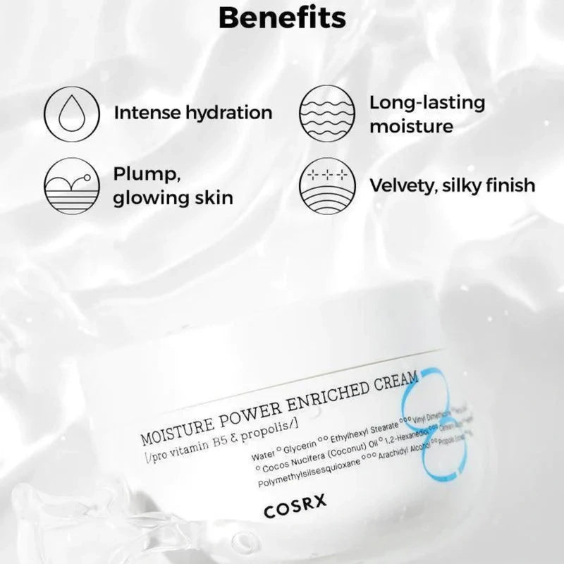 Water, Glycerin, Ethylhexyl Stearate, Vinyl Dimethicone, Pentylene Glycol, Cocos Nucifera (Coconut) Oil, 1,2-Hexanediol, Cetearyl Alcohol, Panthenol, Polymethylsilsesquioxane, Arachidyl Alcohol, Propolis Extract, Hydroxyethyl Acrylate/Sodium Acryloyldimethyl Taurate Copolymer, Polyglyceryl-6 Stearate, Butylene Glycol, Carbomer, Behenyl Alcohol, Glyceryl Stearate, Tromethamine, Dimethiconol, Caprylyl Glycol, Arachidyl Glucoside, Hydrogenated Lecithin, Ceramide NP, Ethylhexylglycerin, Xanthan Gum, Sucrose Stearate, Polyglyceryl-6 Behenate, Sodium Polyacrylate Starch, Stearic Acid, Palmitic Acid, Sodium Hyaluronate, Cholesterol, Hyaluronic Acid, Glycosphingolipids, Hydrolyzed Hyaluronic Acid