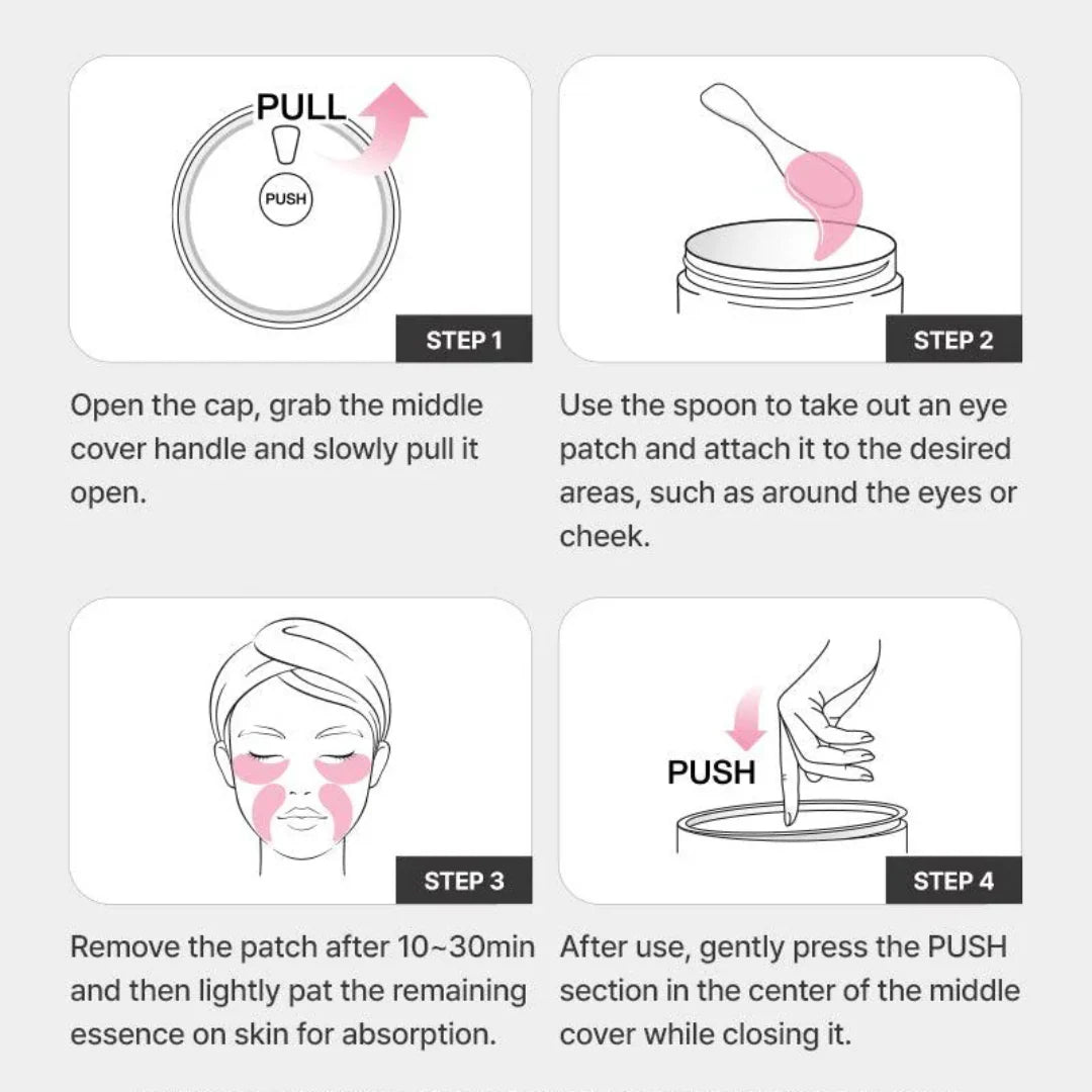 On clean, dry skin, place the gel eye patches under your eyes and leave on for about 10 minutes.