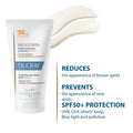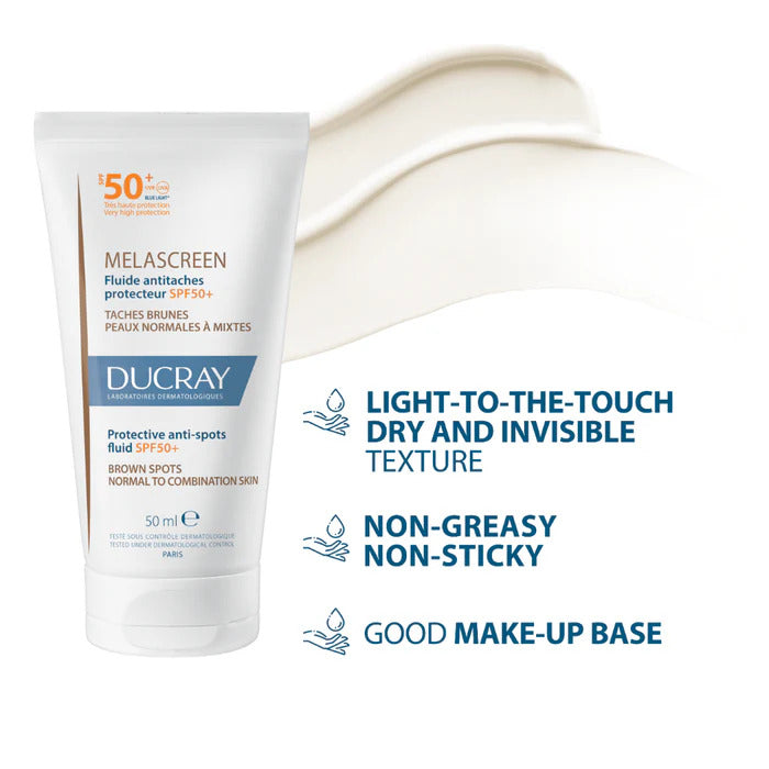 The Ducray Melascreen Protective Anti-Spots Fluid SPF50+ is a daily fluid designed to prevent and reduce the appearance of dark spots. It offers very high protection against UVB, UVA, blue light, and pollution. Formulated with azelaic acid, known to regulate the overproduction of melanin responsible for the formation of dark spots, and a patented broad-spectrum photostable photoprotective system (UVA, UVB, blue light), this fluid provides comprehensive protection.