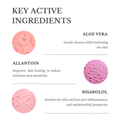 Sodium Laureth sulfate, Cocamidopropyl betaine, Lactic acid, Benzophenone 4, Alpha Bisabolol, Allantoin, Aloe Vera Extract, Sorbitol, Polysorbate-20, glycerin, EDTA, DMDM Hydantoin, Water, Methylisothiazolinone, Methylchloroisothiazolinone.