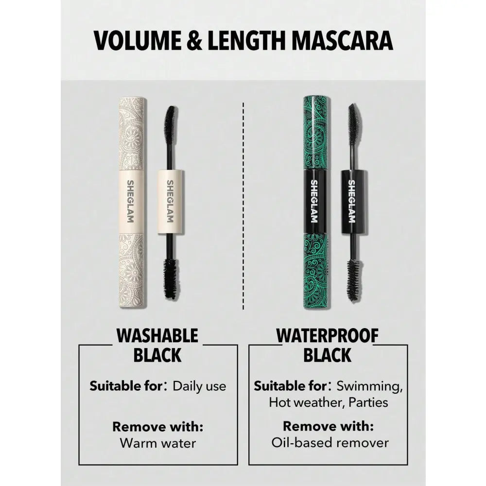 SHEGLAM All-in-One Volume & Length Mascara features a dual-ended brush with two different quick-drying, smudgeproof, yet washable formulas. Apply together or separately for a totally custom, clump-free look that delivers intense volume, length, curl, and separation!