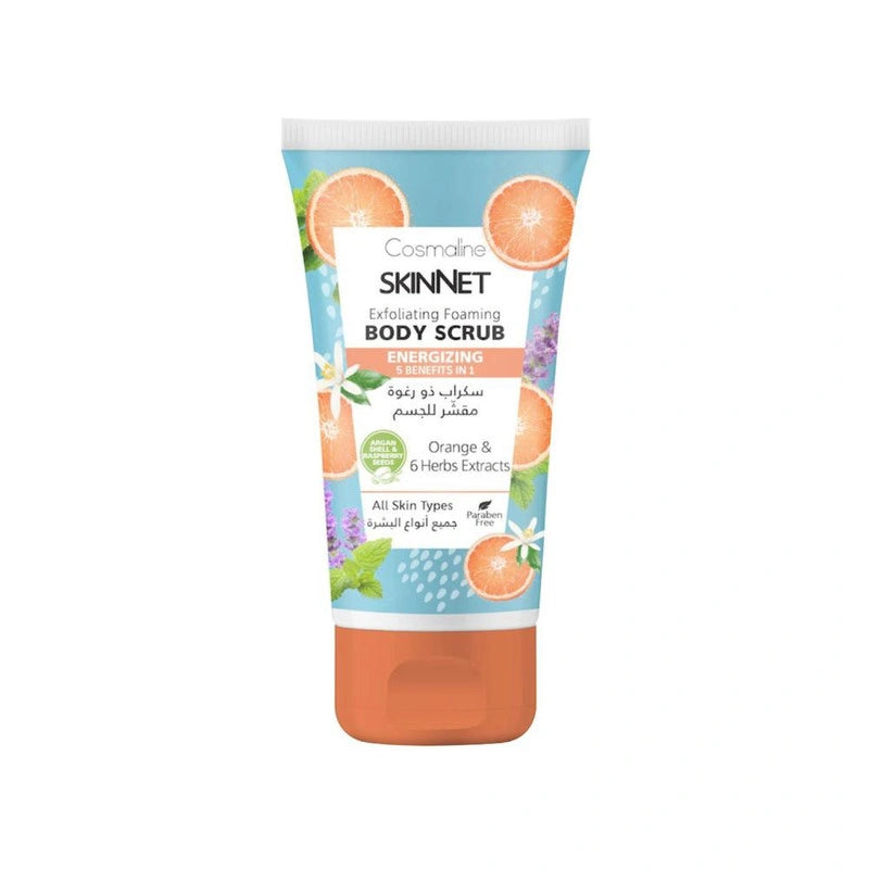 Indulge in a refreshing and invigorating exfoliation with Cosmaline Skinnet Energizing Exfoliating Foaming Body Scrub. This powerful scrub, infused with orange extracts and six herbal extracts, gently removes dead cells, cleanses your skin, and enhances its overall health. A revitalizing body scrub with Orange and 6 Herbal Extracts that exfoliates, cleanses, and hydrates skin. Removes dead cells, cleanses your skin, and enhances its overall health. Benefits: