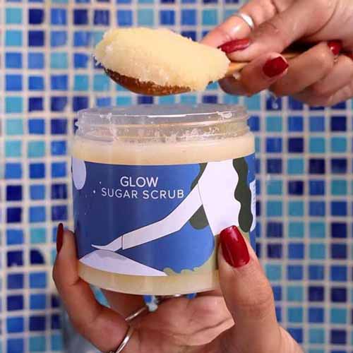 - Scoop a small amount of your sugar scrub and massage it onto damp skin in gentle circular motions and rinse afterwards.